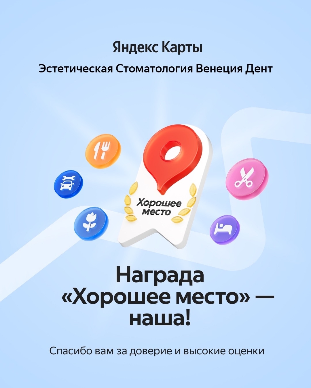 Команда Венеция Дент с гордостью сообщает: мы получили награду «Хорошее место» от Яндекс Карт!